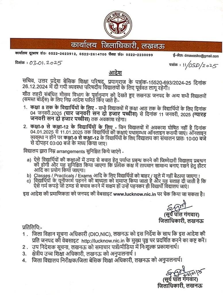 लखनऊ जिला प्रशासन की ओर से जारी आदेश के मुताबिक, ठंड के चलते लखनऊ में 8वीं तक के स्कूलों में 11 जनवरी तक अवकाश घोषित किया गया है। इस दौरान सभी स्कूलों में छुट्टियां रहेंगी। वहीं, 9वीं से 12वीं तक की कक्षाएं ऑनलाइन होंगी, जो सुबह 10 बजे से दोपहर 3 बजे तक चलेंगी।